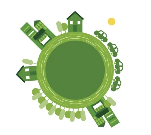 L'immagine rappresenta un disegno della terra con sopra delle case, delle macchine e degli alberi verdi a rappresentare la sostenibilità