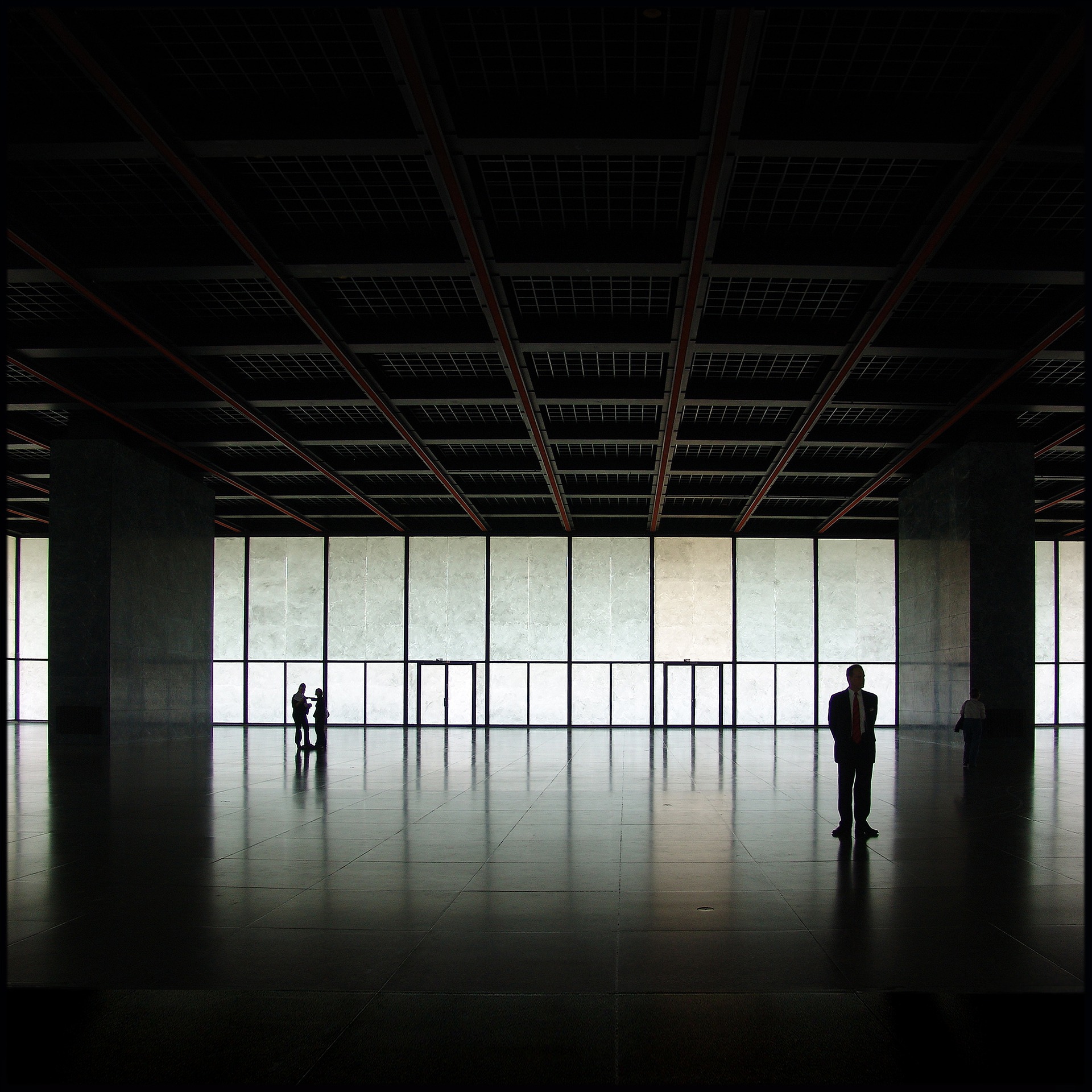 Mies durante la sua carriera si misura anche con il tema di un vasto ambiente coperto continuo e indiviso, senza ostacoli di qualunque tipo, destinato alla collettività, spesso associato a: